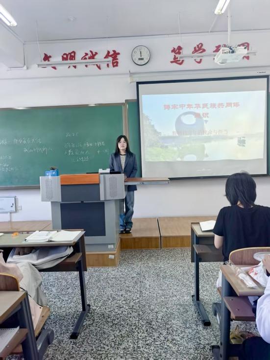 教师车晓慧以真实案例为切入点,开启了“铸牢中华民族共同体意识”融入教学。通过采访参观纪念抗日战争胜利80周年纪念活动的少数民族演员,他们的感想生动展现了中华民族多元一体格局下,各民族像石榴籽一样紧紧抱在一起的生动景象。